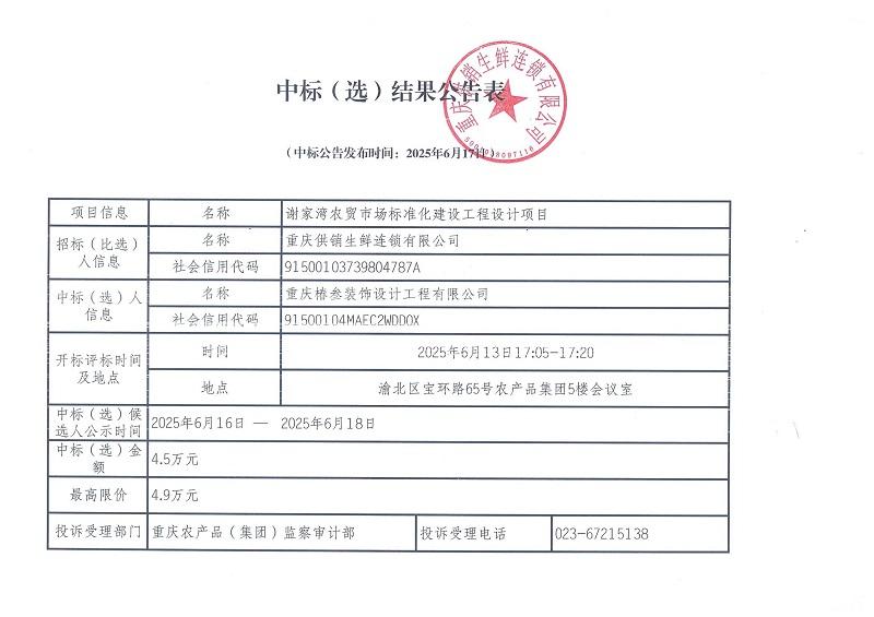 謝家灣農(nóng)貿(mào)市場室內(nèi)裝飾工程項目 中標(biāo)結(jié)果公告表
