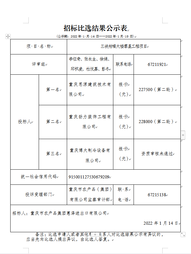 三峽柑橘大樓零星工程項(xiàng)目中標(biāo)結(jié)果公示